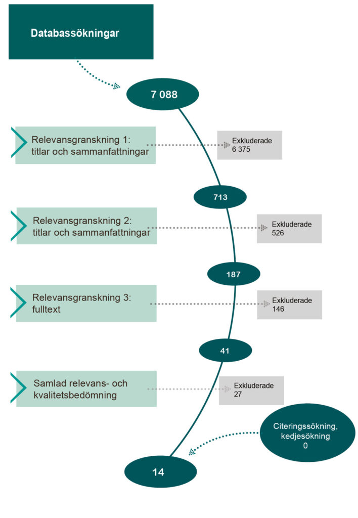 Flödesschemat i figur 1 illustrerar resultatet av litteratursökningarna och urvalet av forskning. Litteratursökningarna genererade 7 088 unika träffar. Den första relevansgranskningen inne bar att medarbetare vid Skolforskningsinstitutet gick igenom alla titlar och sammanfattningar till de studier som identifierats i litteratursökningen och gallrade bort de studier som låg utan för de uppsatta avgränsningarna, som går att läsa mer om i kapitel 5. Efter den första relevans granskningen återstod 713 studier. Den andra relevansgranskningen innebar att projektets forskare från Skolforskningsinstitutet gick igenom titlar och sammanfattningar tillhörande alla studier som kvarstod efter den första gallringen. I nästa steg granskade projektgruppens externa forskare 187 studier i fulltext. Efter fulltextgallringen återstod 41 studier och efter en fördjupad relevans och kvalitetsgranskning utförd av hela projektgruppen återstod 14 studier som uppfyllde kriterierna.