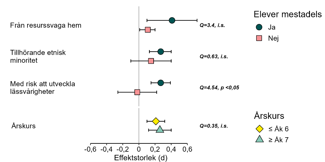 Informationen i diagrammet är hämtad från tabell 4 på s. 10 i översikten. Q-värden visar hur stor skillnad i effektstorlek det är mellan de studier där en majoritet av eleverna tillhörde gruppen, jämfört med de studier där en majoritet av eleverna inte tillhörde gruppen. Statistiskt säkerställda skillnader markeras p <0,05, och icke-signifikanta skillnader markeras i.s.