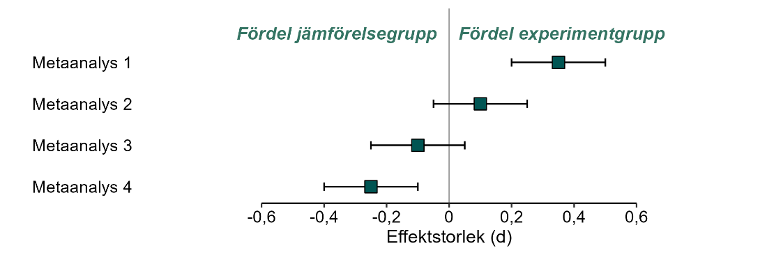 I diagrammet visar metaanalys 1 ett resultat till fördel för experimentgruppen. Metaanalys 4 visar ett resultat som är till fördel för jämförelsegruppen. Metaanalys 2 och metaanalys 3 visar resultat där det inte är någon statistiskt säkerställd skillnad mellan experiment- och jämförelsegrupperna. Det kan man utläsa av att den linje som representerar konfidensintervallen korsar mittlinjen.