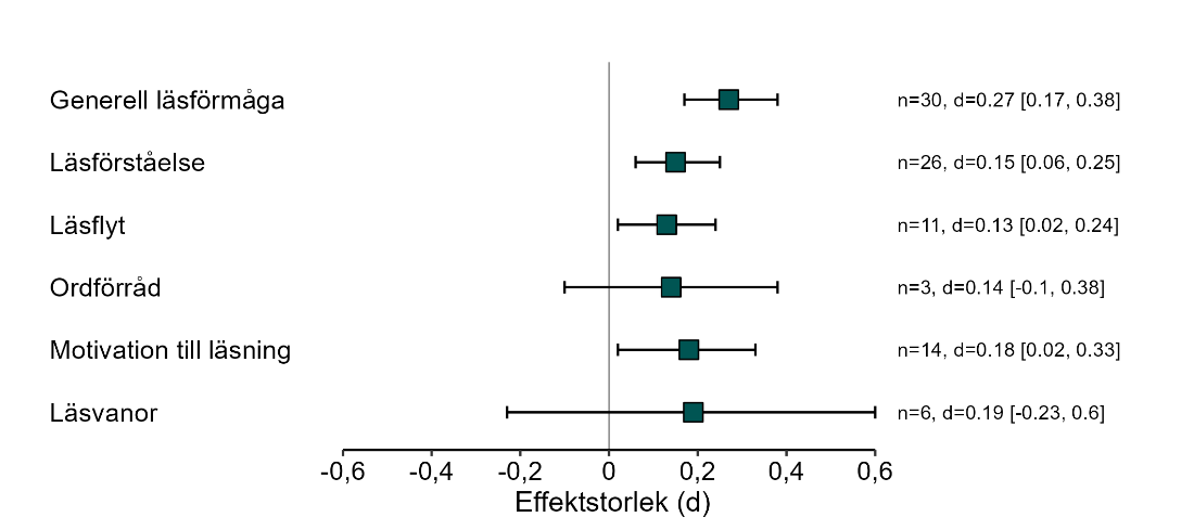 Informationen i diagrammet är hämtad från tabell 2 på s. 9 i översikten. Punkterna markerar den sammanvägda effektstorleken för respektive läsfärdighet efter avslutad intervention, och de horisontella linjerna visar konfidensintervallet (95 %). För varje metaanalys anges hur många studier som ingick (n), det sammanvägda effektmåttet (d) samt konfidensintervallets spann (i hakparentes).