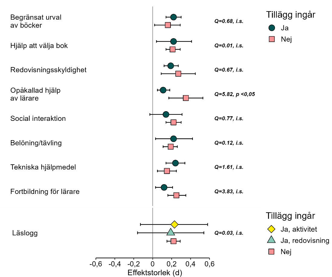 I nästa steg undersökte forskarna om olika typer av tillägg kan ha betydelse för hur stor effekten blir, se figur 3. Denna undersökning gjorde forskarna med hjälp av en så kallad moderatoranalys. Det är en statistisk metod för att undersöka om en viss variabel, så kallad moderator, kan förklara variationen i effekt mellan studier i en metaanalys – i det här fallet vilken effekt ett enskilt tillägg hade på elevers läsförmåga. Att effekten är signifikant i en grupp men inte i en annan betyder inte per automatik att grupperna skiljer sig från varandra. Moderatoranalysen visar om skillnaden i effektstorlek är större än vad vi kan förvänta oss av slumpen. Q-värdet visar hur stor variationen är mellan grupperna, och p-värdet visar om skillnaden är statistiskt säkerställd. Ett högt Q med lågt p visar att det finns en signifikant skillnad mellan gruppernas effektstorlekar, det vill säga stöd för att det finns en moderatoreffekt. Omvänt visar ett lågt Q med högt p ingen statistiskt säkerställd skillnad, det vill säga inget stöd för att det finns en moderatoreffekt.