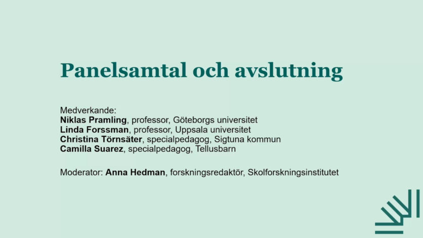 Avslutande panelsamtal vid Skolforskningsinstitutets konferens ”Praktiknära forskning i förskolan – samverkan för barns utveckling och lärande”.